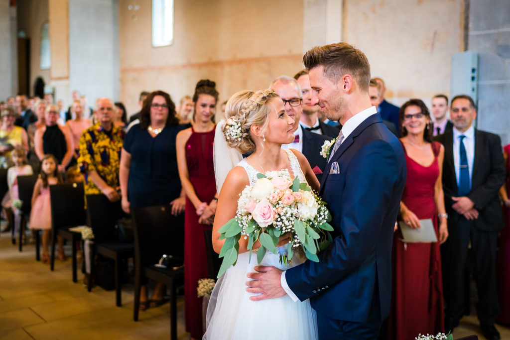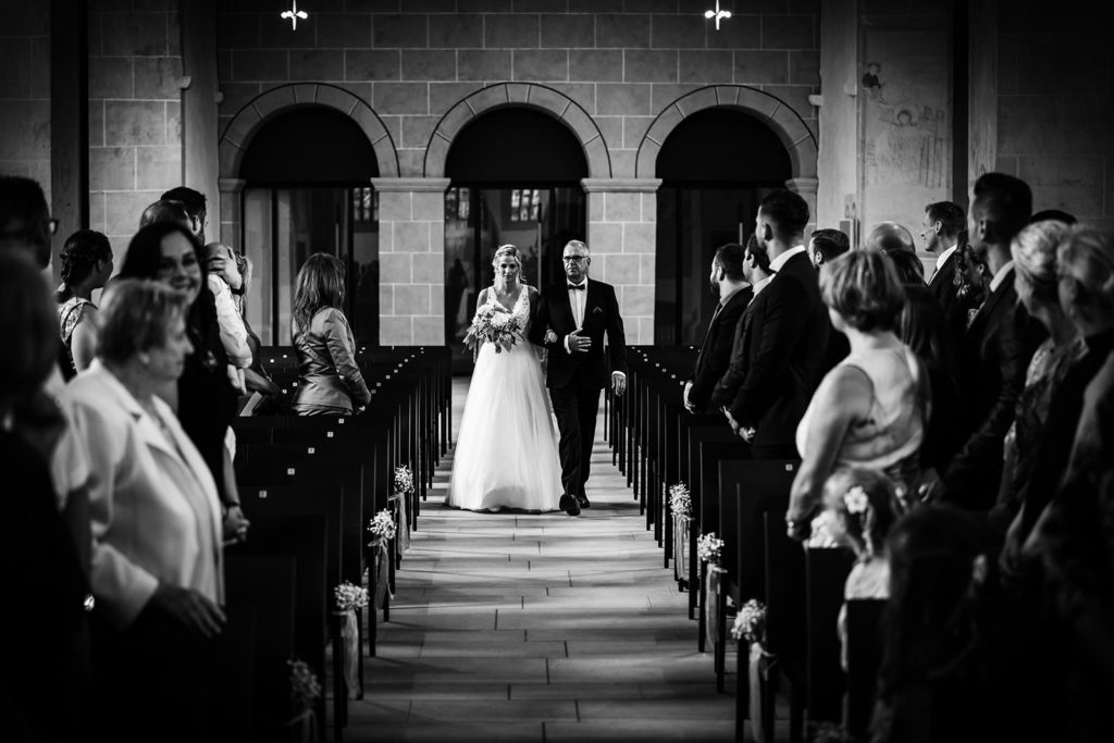 Laura zog klassisch an der Seite ihres Vater in Kirche ein. Alle in der Kirche waren verzückt von der atemberaubend hübschen Braut. Der Gänsehautmoment für Tobias