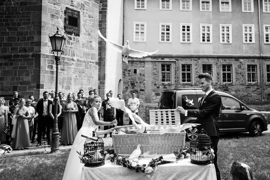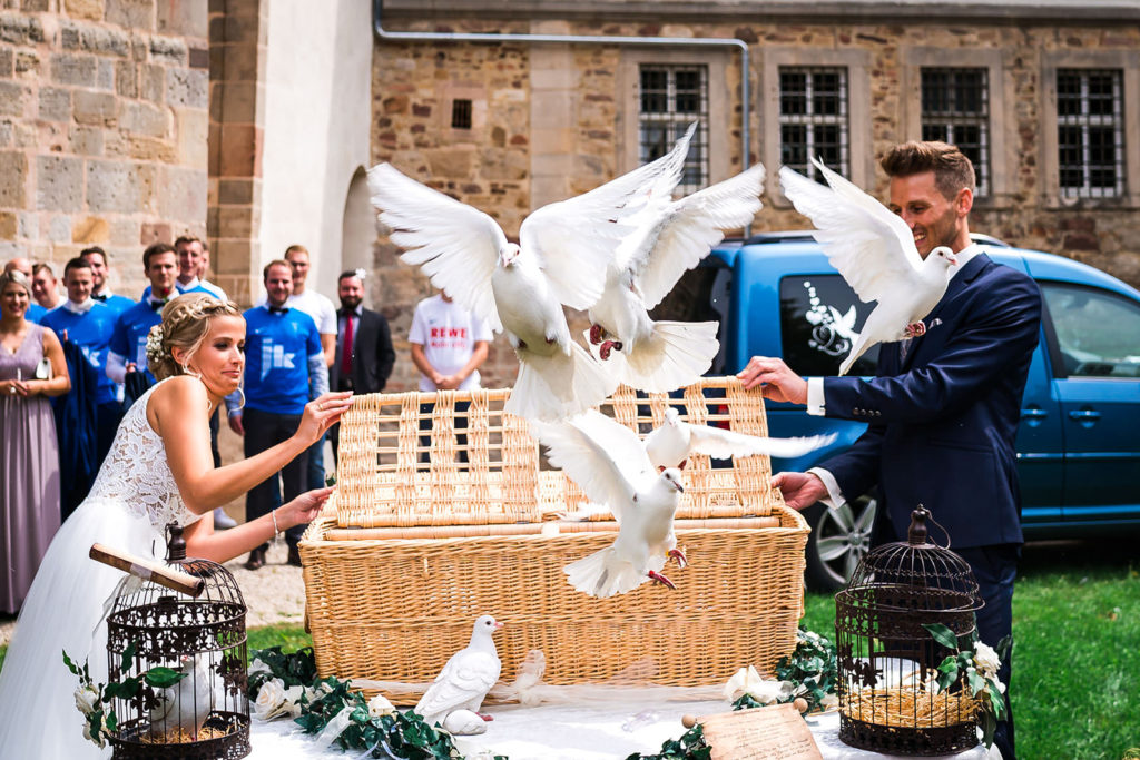 Nach den Gratulationen durften die Beiden noch „respekterfüllt“ weiße Tauben fliegen lassen.